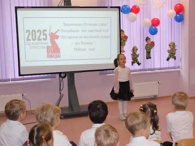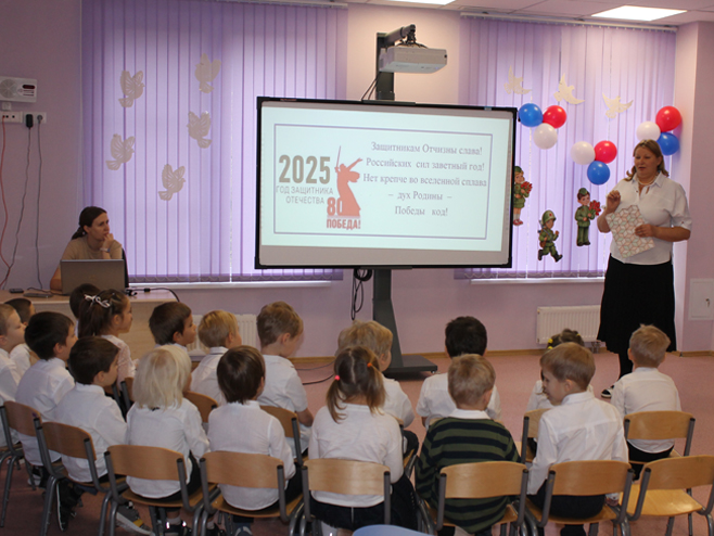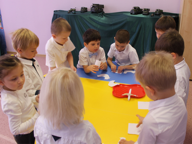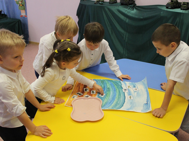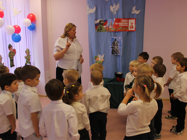 Воспитатель рассказала детям, что Защитники Отечества — это те, кто служит в армии или готов защищать свою страну. Познакомила детей с историей, подвигами героев и как важно помнить о героическом прошлом своей страны и ценить тех, кто сражался за мир и свободу.