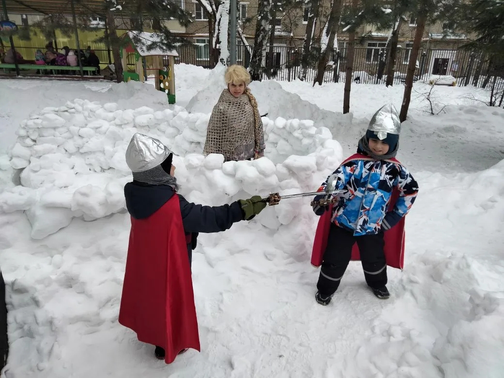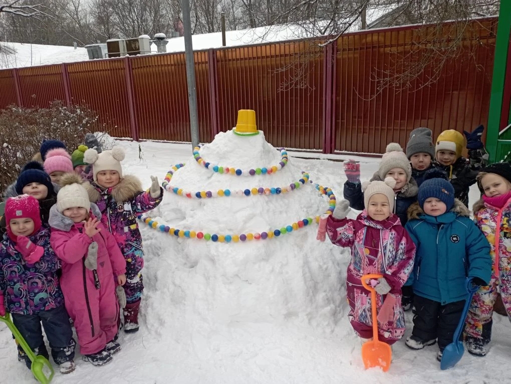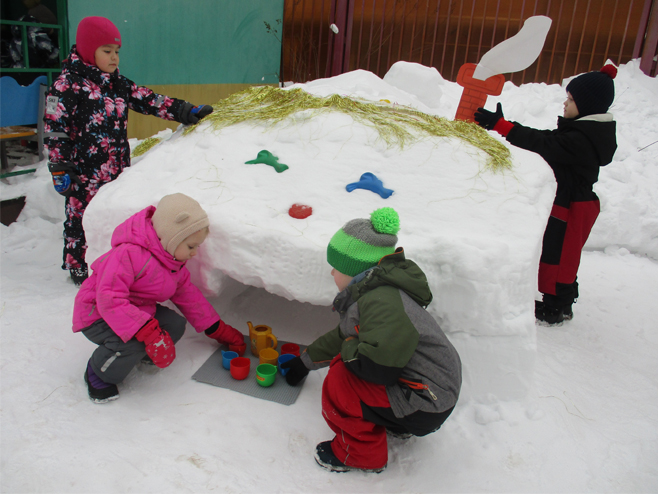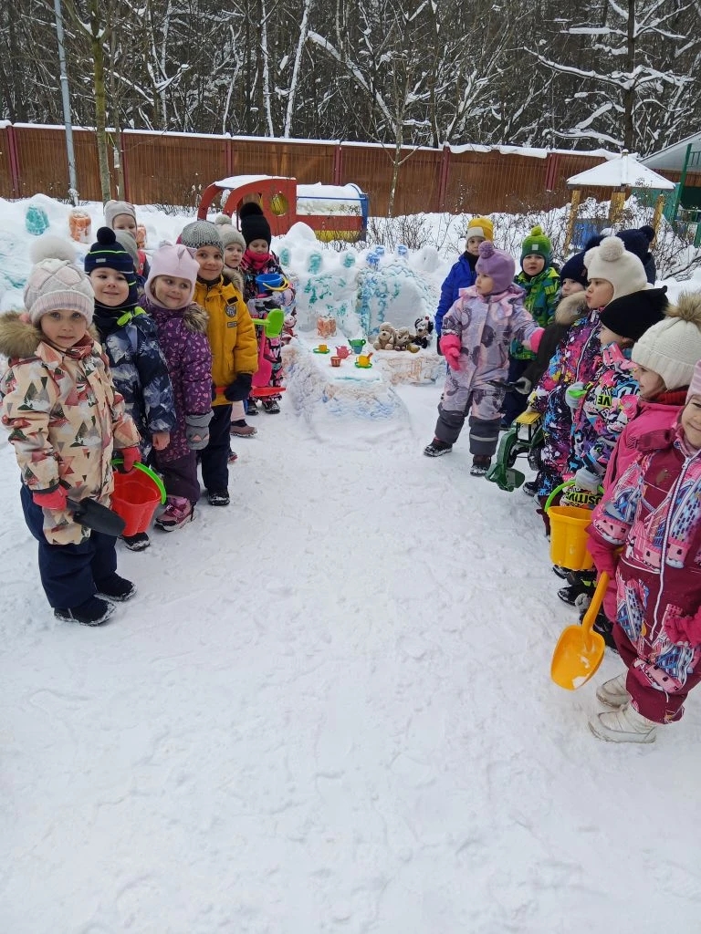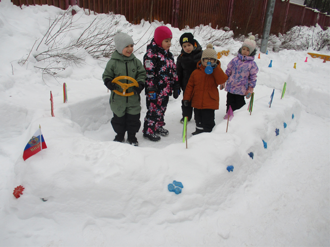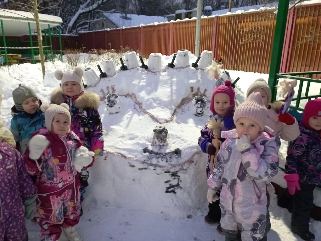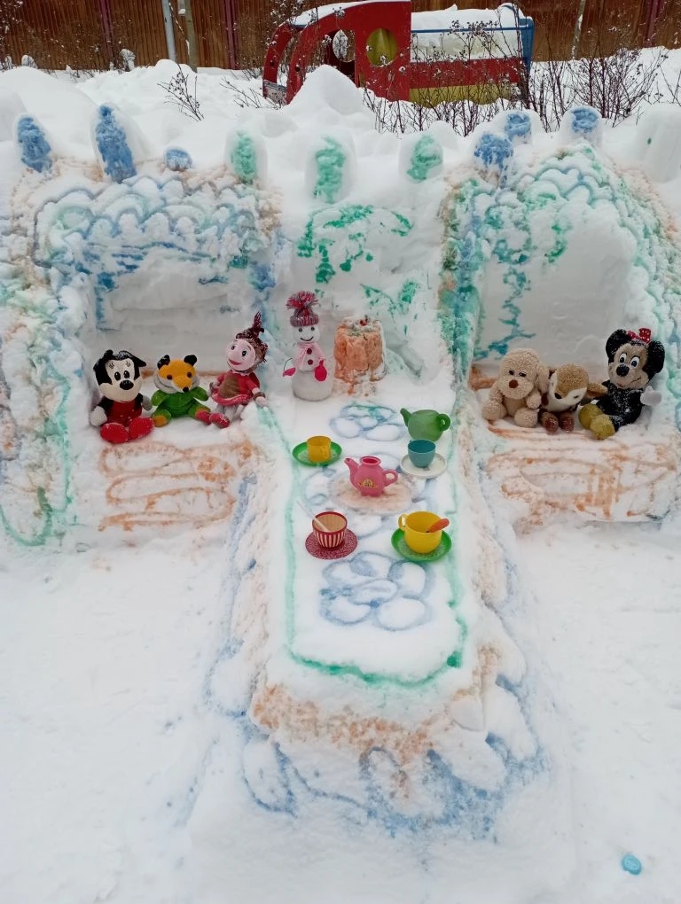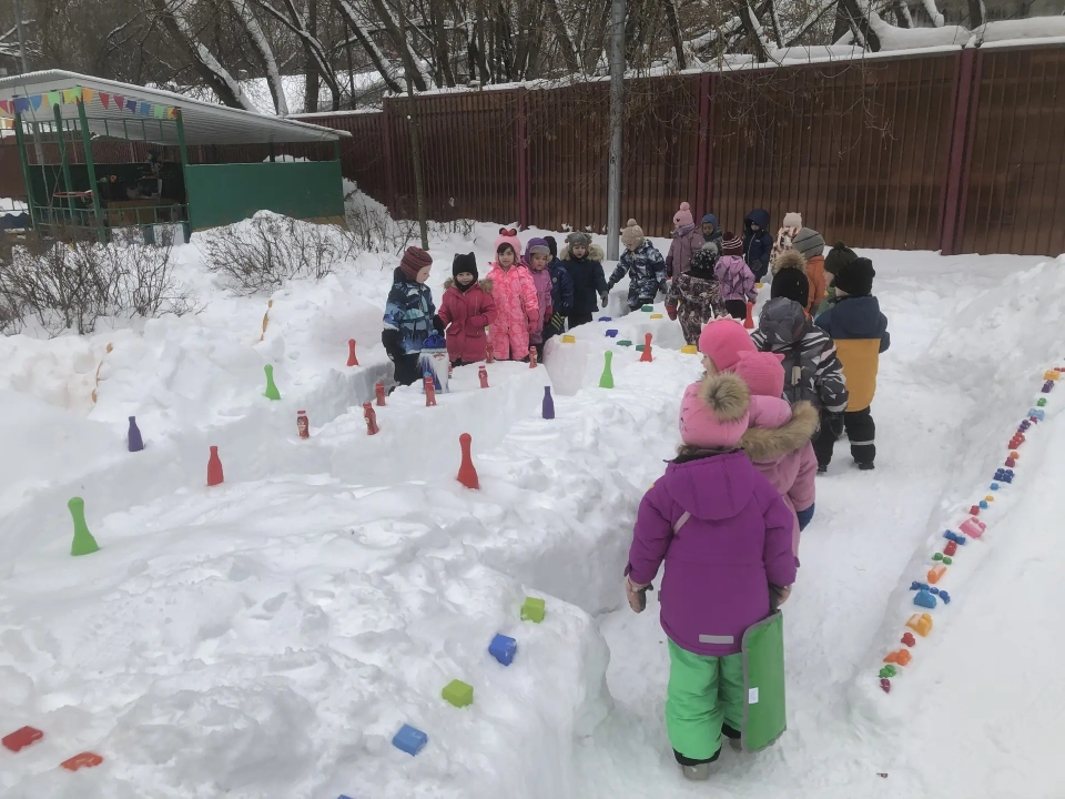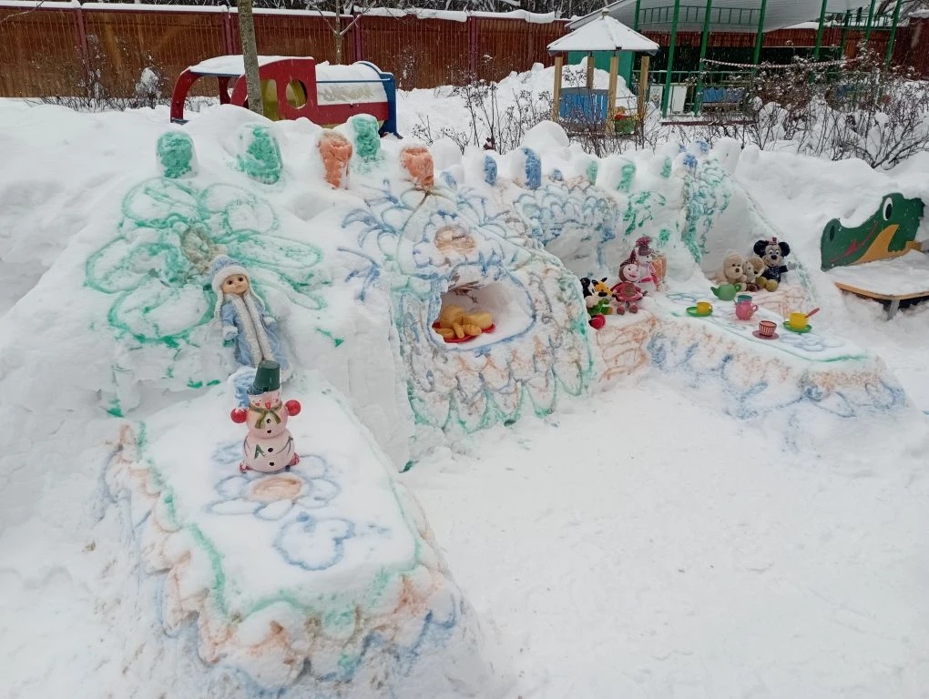 Ни снег, ни холод не помешали детям и воспитателям построить из снега снежные крепости, персонажей сказок, лабиринты, дорожки с воротами, кольцебросы, мишени для метания и разнообразные скульптуры, создающие сказочную атмосферу и способствующие развитию двигательной активности и творчества.
