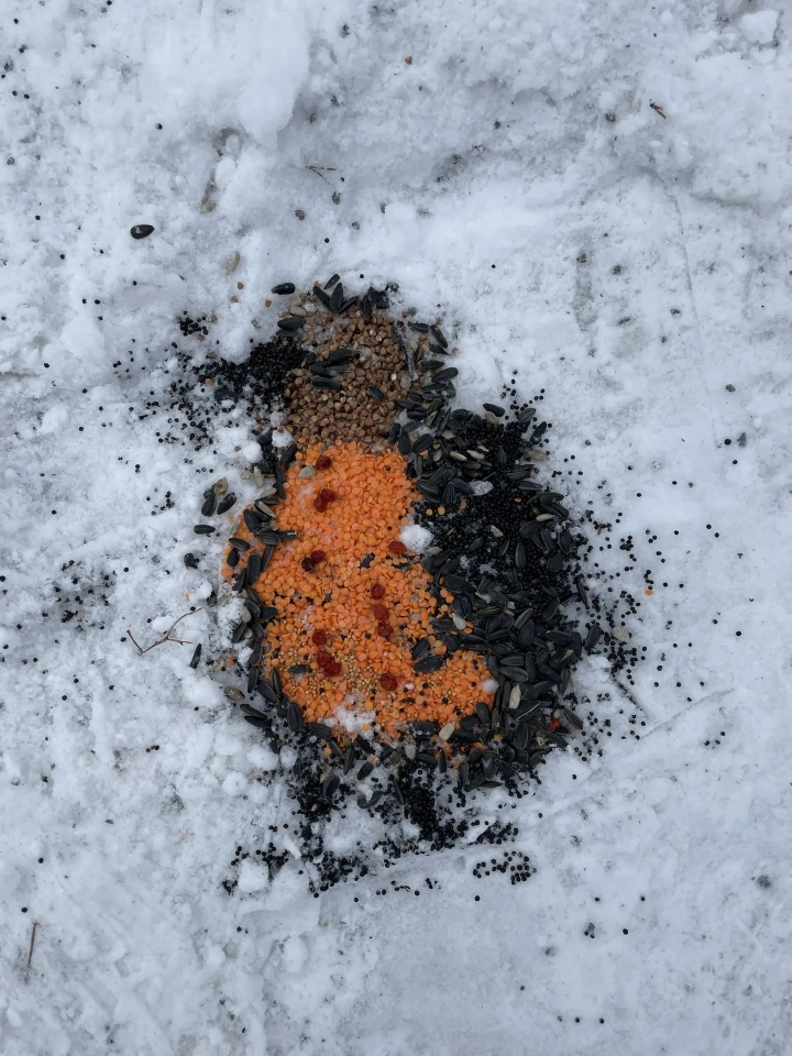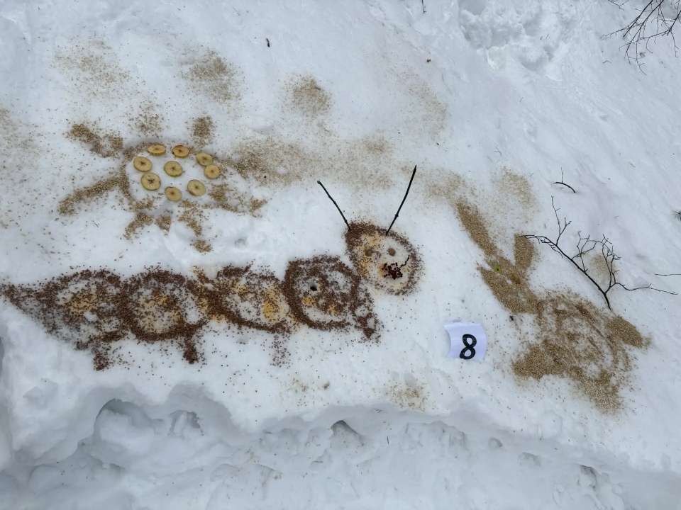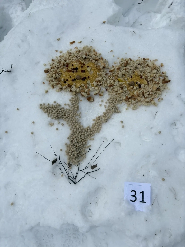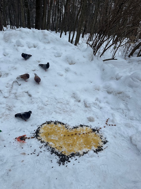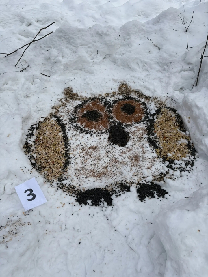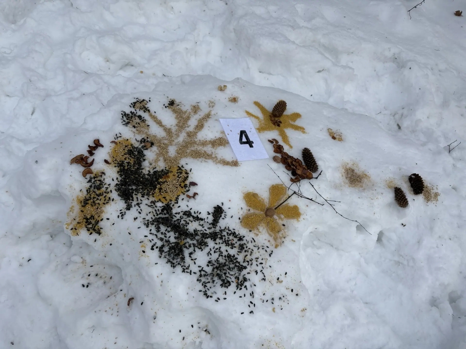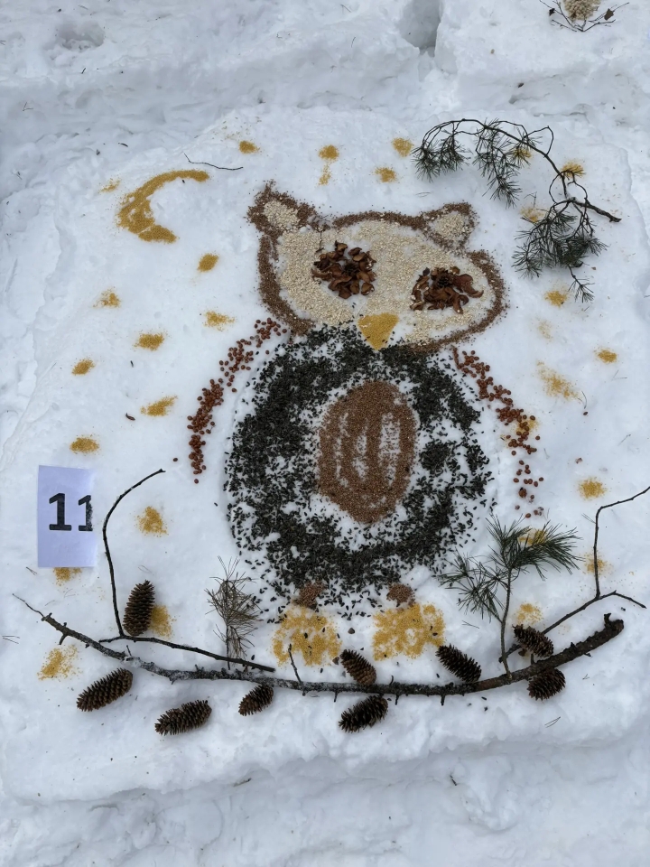 И скоро снежные холсты превратились в настоящие арт-объекты с лакомствами для зверей и птиц. А птицы с заметным нетерпением ждали, когда люди отойдут от своих работ, а самые смелые начали банкет, прямо рядом с художниками.