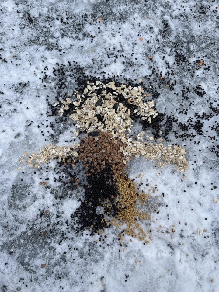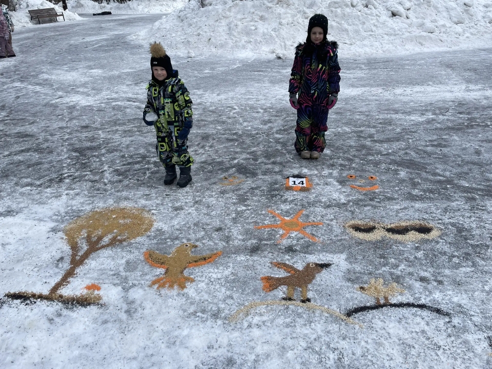 Рисунки на снегу наши художники создавали только из природных материалов. Можно было использовать опилки, найденные под снегом веточки и шишки, сено, щепу, крупы, сушеные ягоды рябины и боярышника, жёлуди, несолёные семечки, подсушенные крошки белого хлеба и т.п.