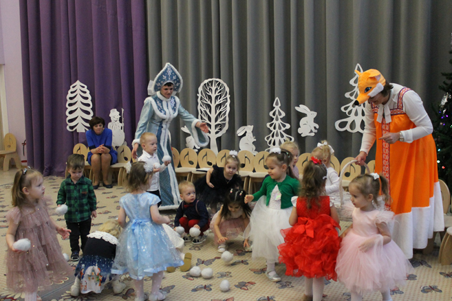 В гости к ребятам пришли Снегурочка, Лисичка, мама Зайчиха, с которыми дети поиграли в веселые игры.
