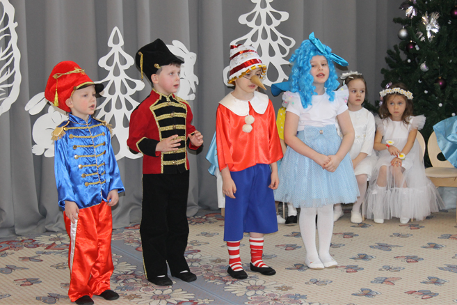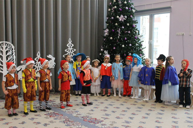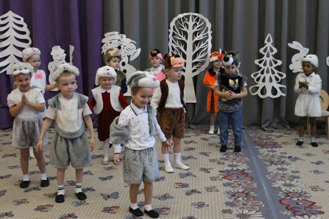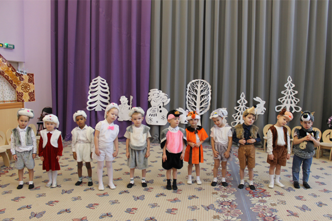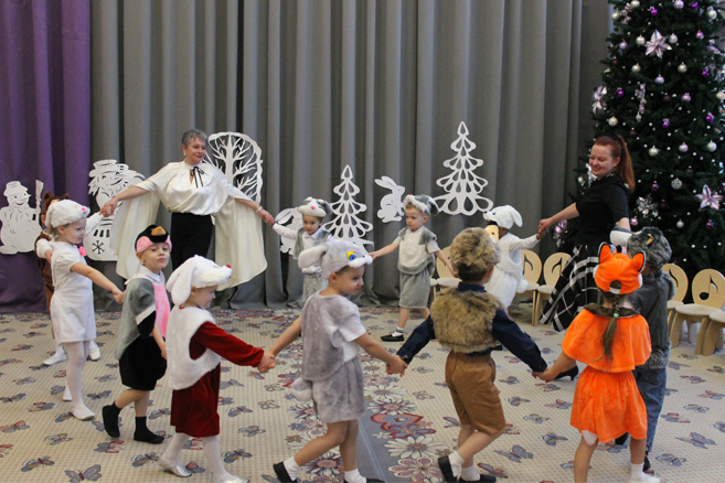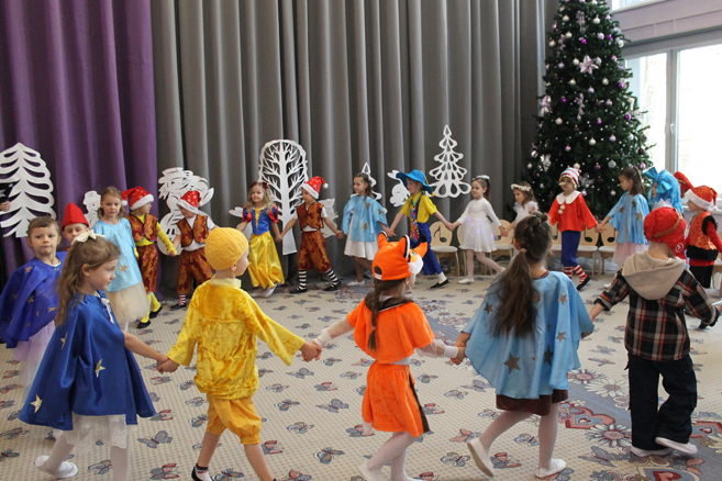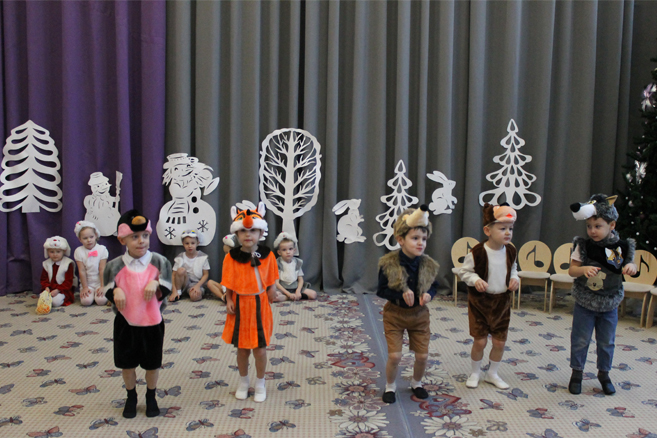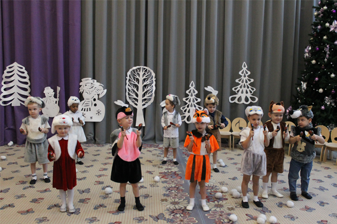 Дети пришли на представление нарядные - мальчики в костюмах зверей и сказочных героев, а девочки в костюмах снежинок и звездочек, весёлые в предвкушении праздника.