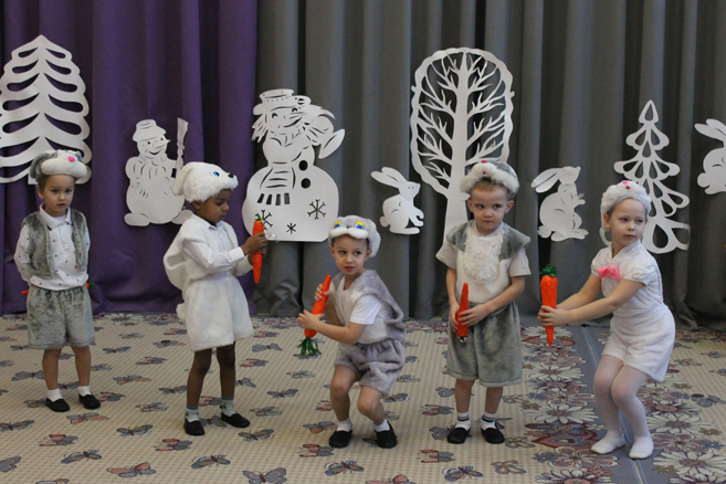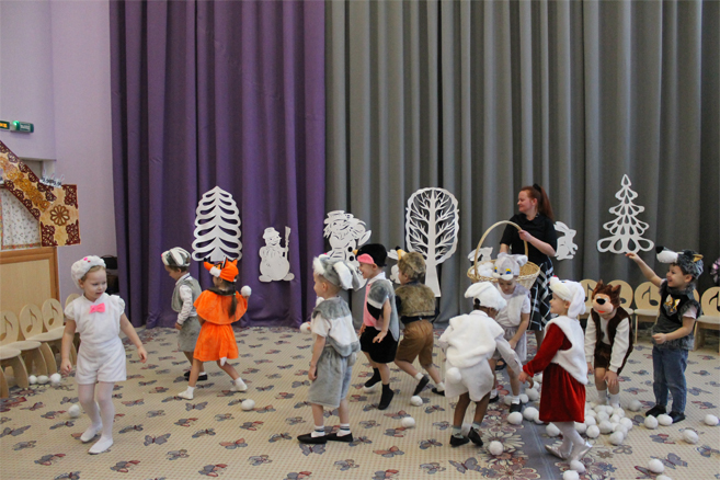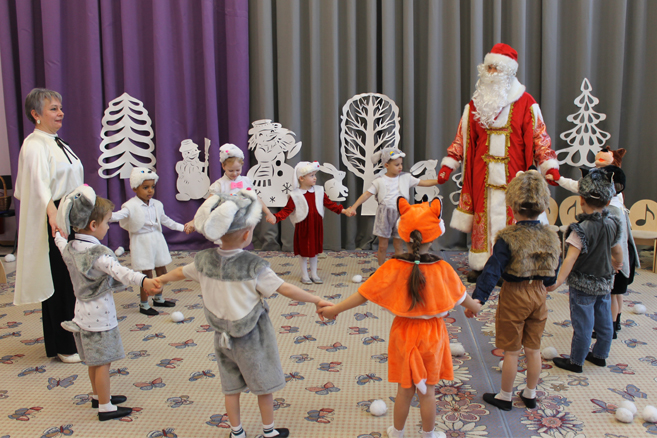 И вот закружились в хороводе Зайчики, Белочки, Лисички, Мишки, Снеговики, Новогодние Снежинки в ожидании главного гостя праздника Дедушки Мороза.