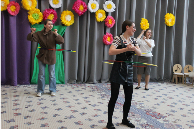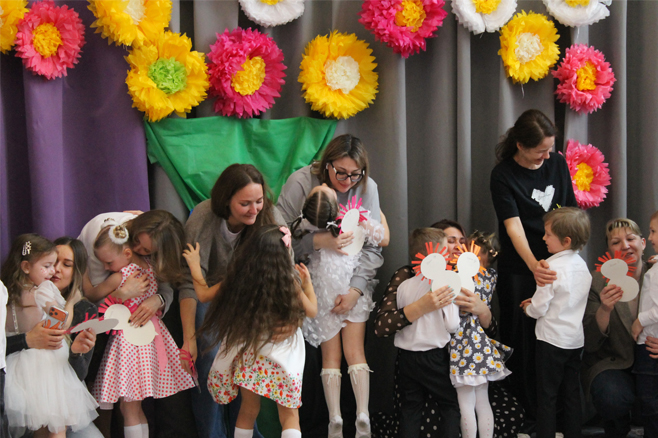 Поздравление получилось ярким и нежным, с замечательными сценками, задорными плясками, интересными играми и душевными песнями! А самыми активными участниками праздника были сами мамы.